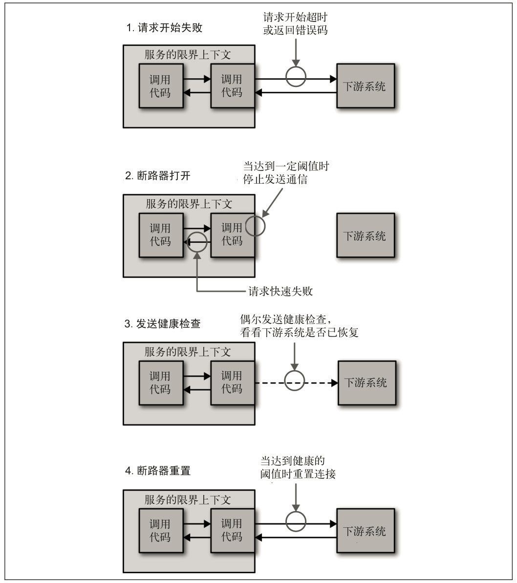 所以当多次访问一个服务失败时,应熔断,标记该服务已停止工作,直接返回错误。直至该服务恢复正常后再重新建立连接。