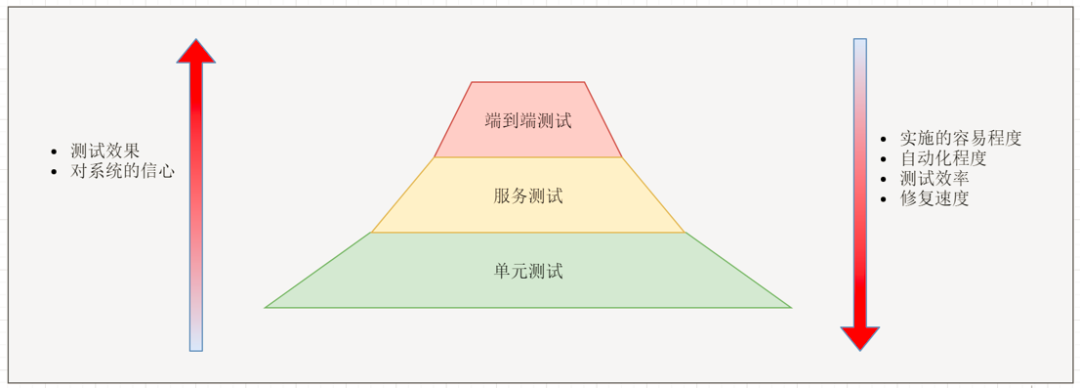 三种测试按照从上到下实施的容易程度递增,但是测试效果递减。端到端测试最费时费力,但是通过测试后我们对系统最有信心。