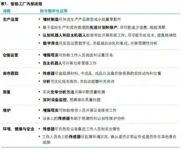 不同企业将在不同程度上受到智能工厂对其制造流程的影响。德勤已发现部分先进技术能够促进物理世界与数字世界间的信息流动与传递。29这些技术推动了数字化供应网络甚至智能工厂的发展——为生产流程的数字化创造新的契机。表1列示了智能工厂的核心制造流程,以及各种数字与物理技术所带来的数字化机遇。