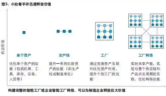事实上,从小处着手,在可控环境下检测理念,并推广所获得的经验,可达到更加理想的效果。一旦实践成功,便可将解决方案推广到其他资产、生产线和工厂,从而有机会创造巨大价值(图3)。