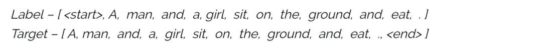 为了训练LSTM模型,我们预先定义了标签和目标文本。比如,如果字幕是A man and a girl sit on the ground and eat .(一个男人和一个女孩坐在地上吃东西),则我们的标签和目标文本如下: