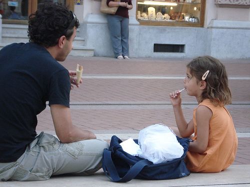 A man and a girl sit on the ground and eat . (一个男人和一个女孩坐在地上吃东西)
