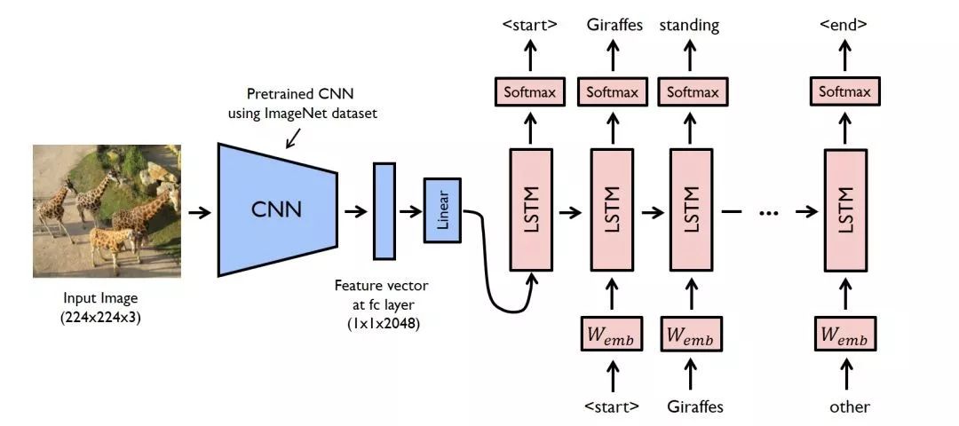 通常,一个预先训练好的CNN网络从输入图像中提取特征。特征向量被线性转换成与RNN/LSTM网络的输入具有相同的维度。这个网络被训练作为我们特征向量的语言模型。