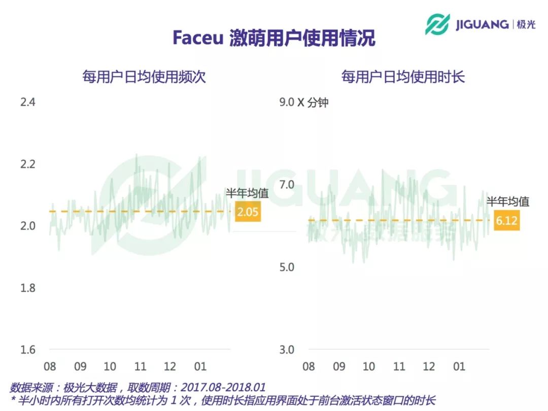 伴随着“激萌传送门”以及“遇见萌友”等社交功能的加入,Faceu激萌对于自身的定位也从单纯的拍照P图类工具转变为短视频社交平台。极光大数据的统计结果显示,过去半年中每名用户平均每天会打开Faceu激萌2.05次,每天的使用时长为6.12分钟。