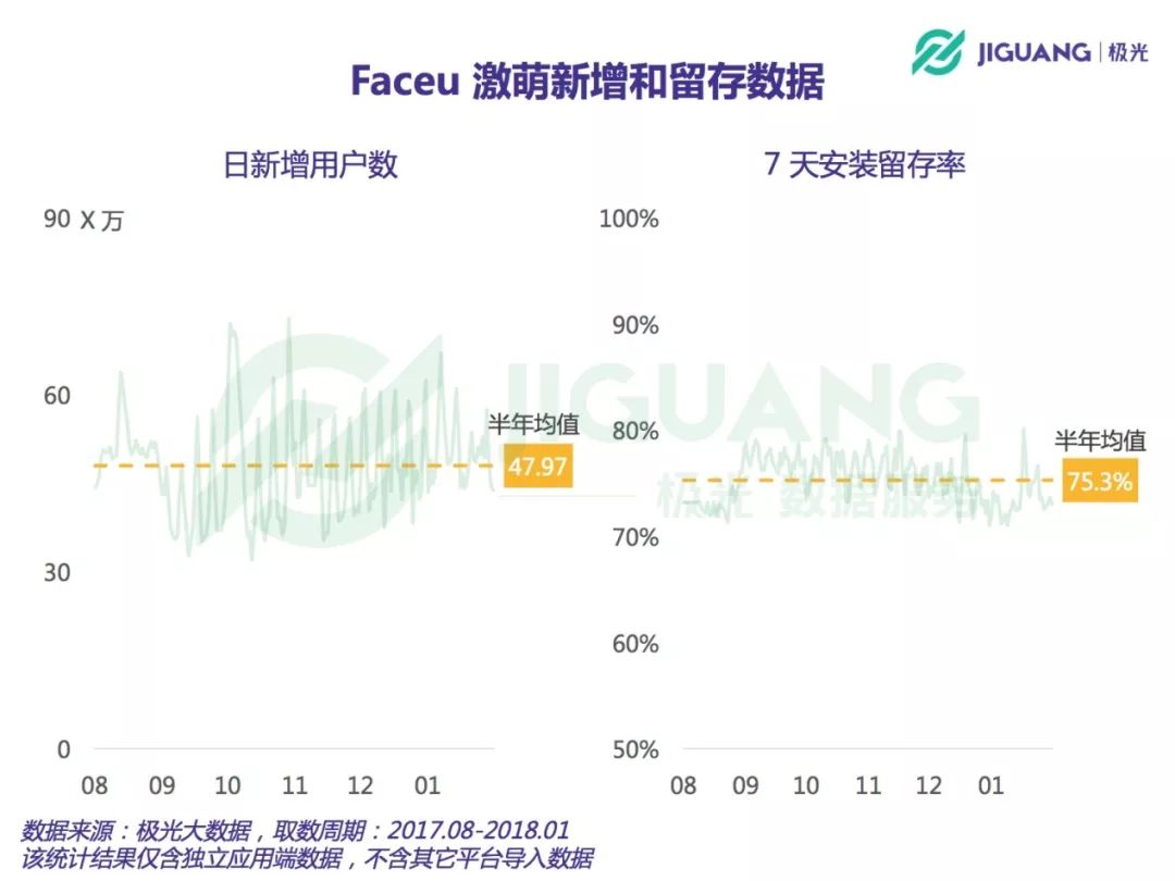 在日新增用户数上,Faceu激萌并未表现出明显的上升或下降趋势,其日新增用户数半年均值为47.97万。与此同时,Faceu激萌的7天安装留存率半年均值为75.3%。