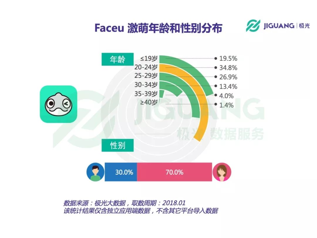 极光大数据显示,在Faceu激萌用户中,女性的占比达到70%。与此同时,根据用户年龄分布结果,该应用有54.3%的用户年龄处于24岁及以下,81.2%不足30岁。由此可见,Faceu激萌对于年轻女性用户有着较大的吸引力。