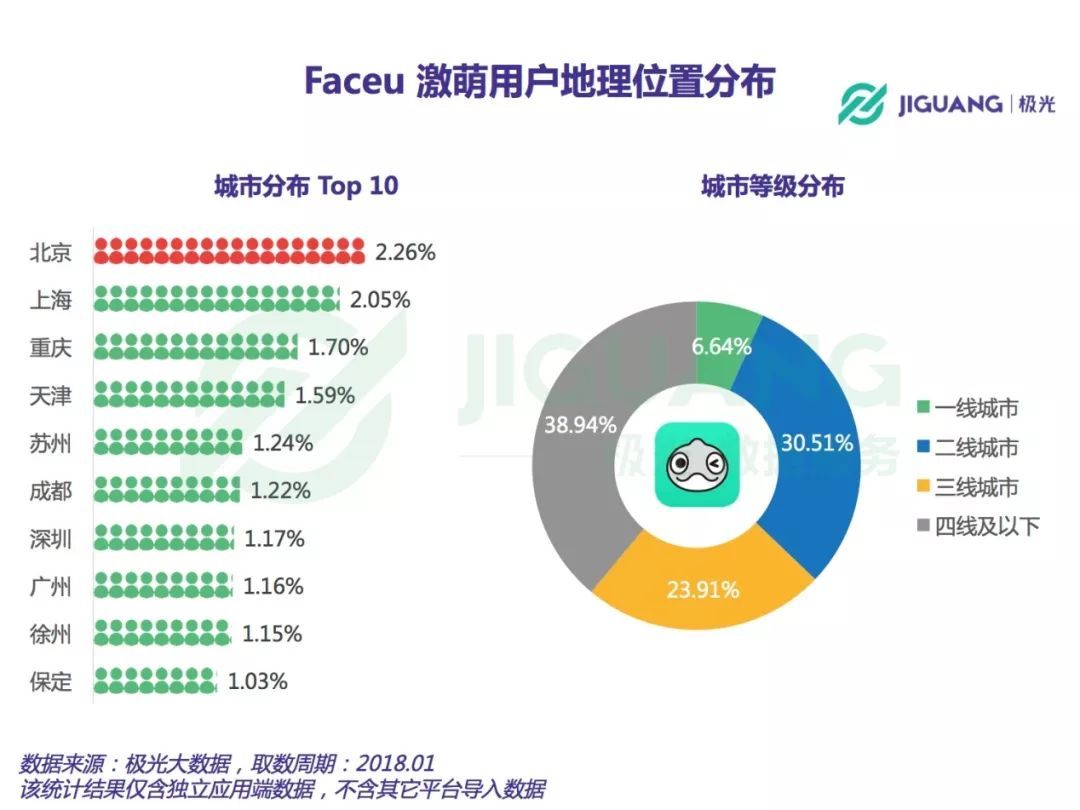 根据极光大数据发布的《2017年移动互联网行业盘点应用榜单》,截至去年年底,Faceu激萌的市场渗透率在“拍照P图”榜单中位列第三,仅次于美图公司旗下的美图秀秀和美颜相机。