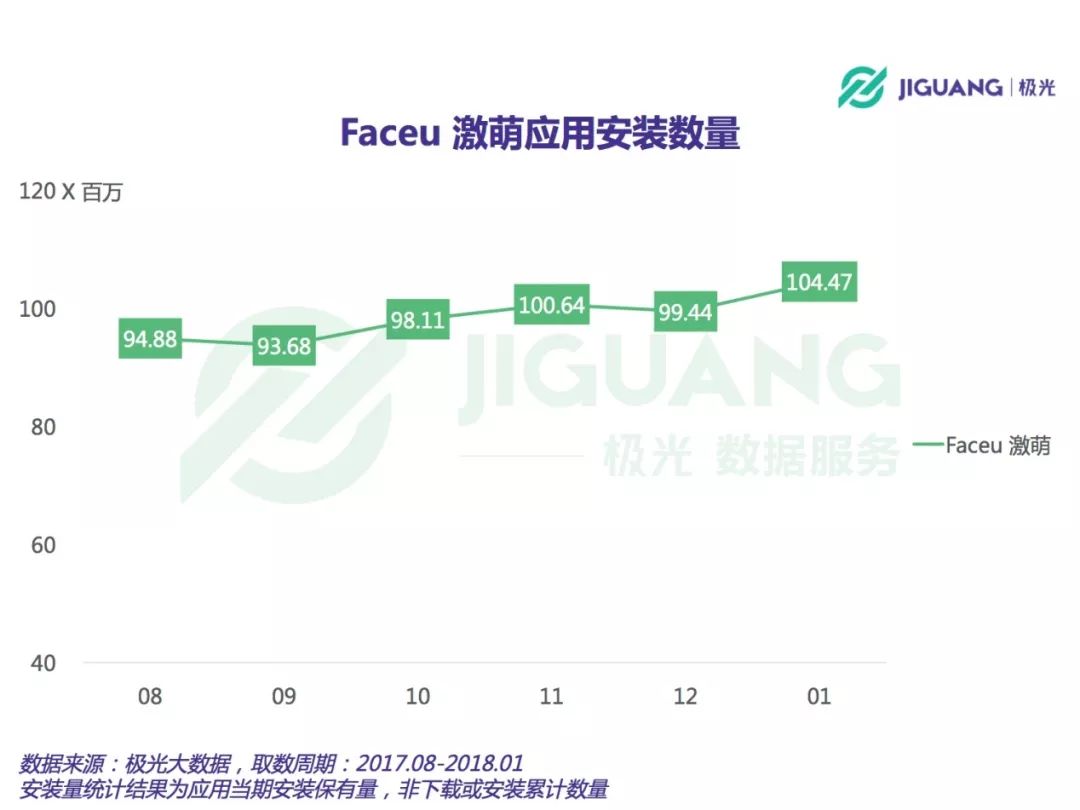 在过去半年中,Faceu激萌的应用安装量始终位于9,000万以上。截至今年1月底,这款应用的安装数量已经达到1.04亿。就用户基数而言,Faceu激萌俨然是一款“超级应用”。