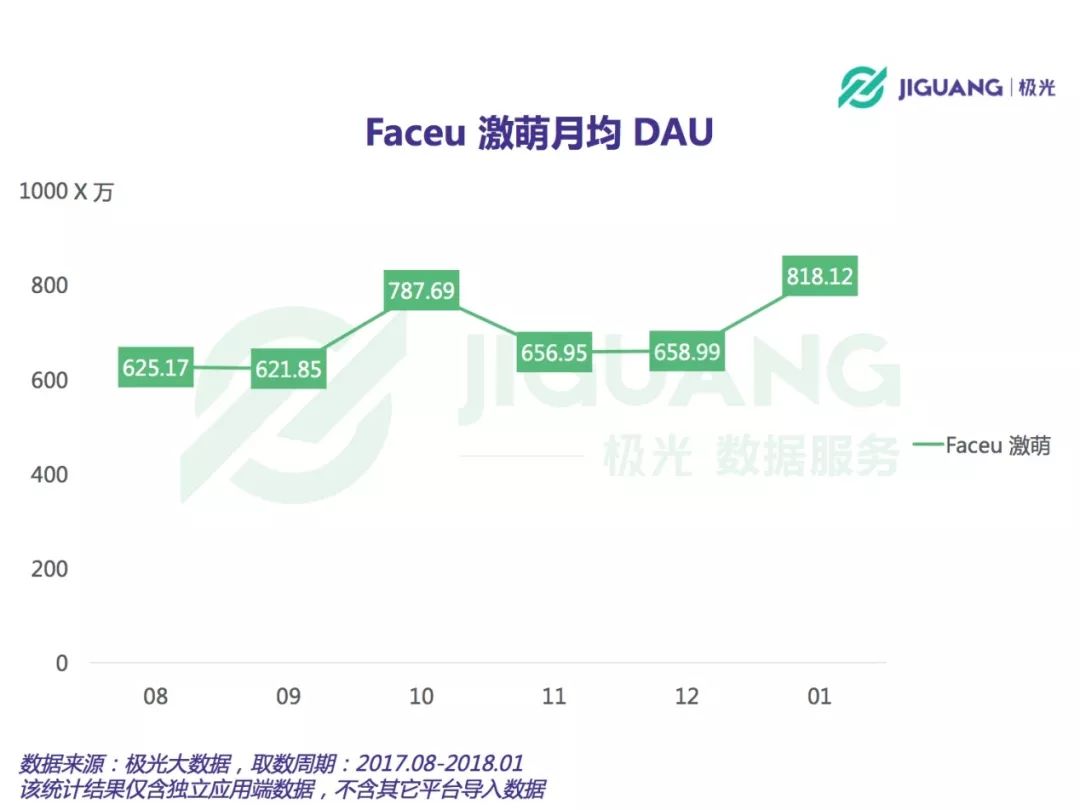 得益于庞大的用户基数,Faceu激萌在月均DAU上也有着不俗的表现。根据极光大数据的统计结果,Faceu激萌的月均DAU数值在过去半年内始终位于600万以上。截至今年1月份,其月均DAU数值为818.12万。