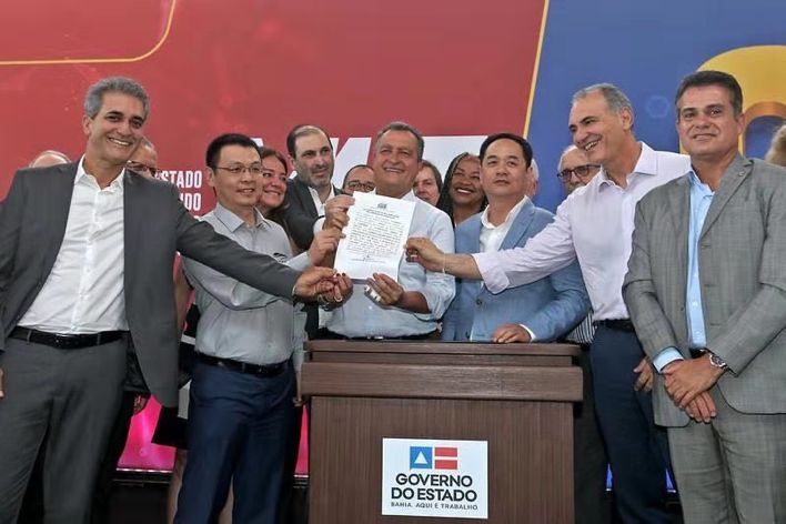 在巴伊亚州民政部长Bruno Dauster(后排中)的见证下,比亚迪巴西分公司总经理李铁与巴伊亚州交通运营公司CTB主席José Eduardo Ribeiro Copello共同签署整体设计方案合约
