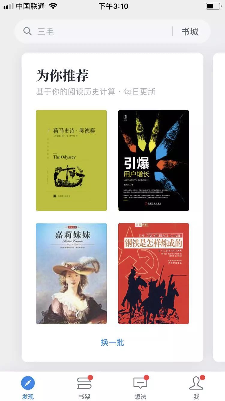 基于大数据的个性化推荐已经成为产品留住用户非常重要的手段,很多产品都受益于此。从“为你推荐”页面的入口设置来看——打开页或是往右滑动一次即可看到,微信读书对这种分发机制是非常重视的。