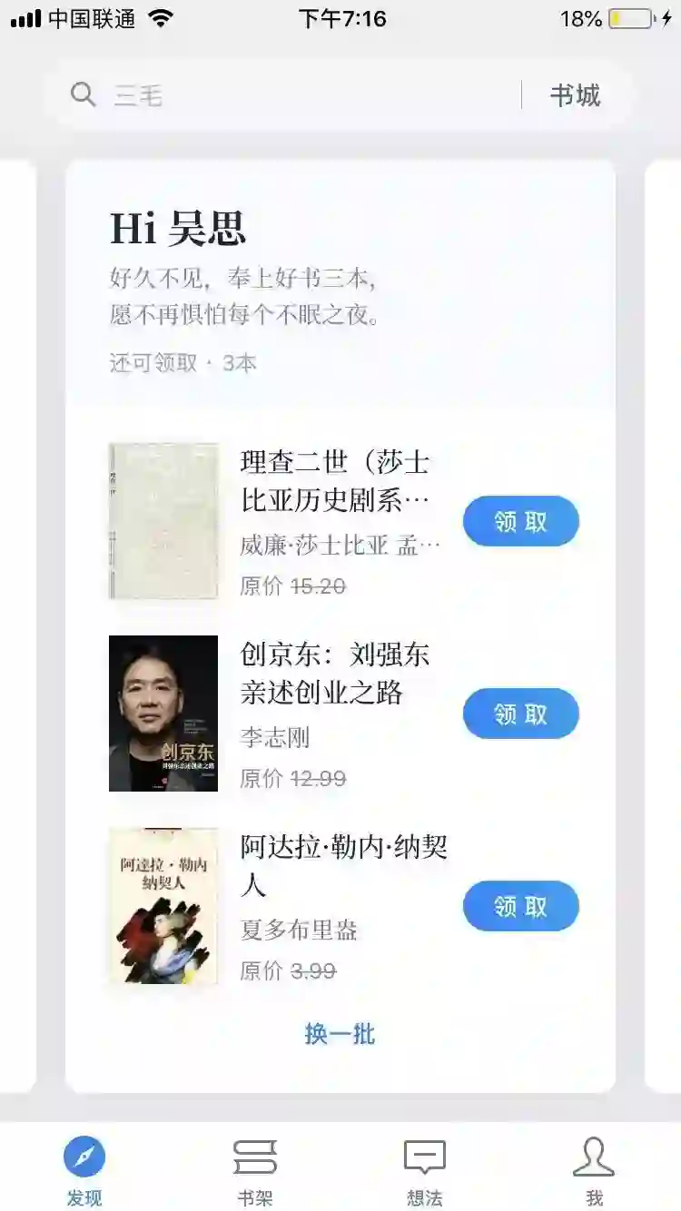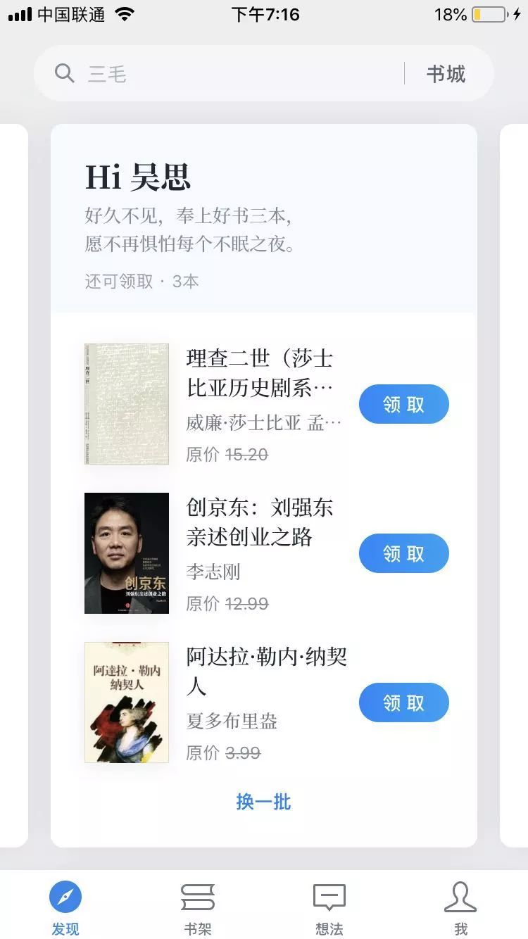 而且送的书也是基于已有的书的种类推荐的,比如我在微信读书上选过的第一本书就是莎士比亚的《亨利四世》,某次打开就发现,被赠送了《查理二世》,看到之后还是很开心的。因为是自己很感兴趣的,后续有阅读,所以从我个人的经验来看,这一赠书的方式对老用户的留存和促活也是很有效的。