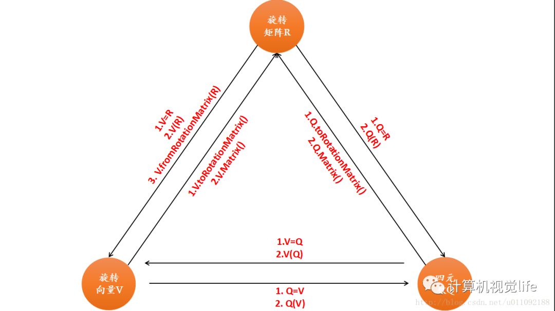 上述四种旋转表达方式是可以相互转化的。在Eigen中它们之间的转化非常的方便。下图是我看的别人总结的旋转矩阵、四元素、旋转向量之间的相互转化图: