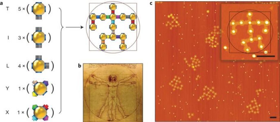 这个团队还借用过达·芬奇的另一幅作品,著名的手绘《维特鲁威人》,用DNA积木拼出了一个简易版本。在实验室中,纳米颗粒根据碱基配对原则成功自组装成一个人形,虽然依小编看来……呃,这个图案与其艺术原型的相似度有些勉强。