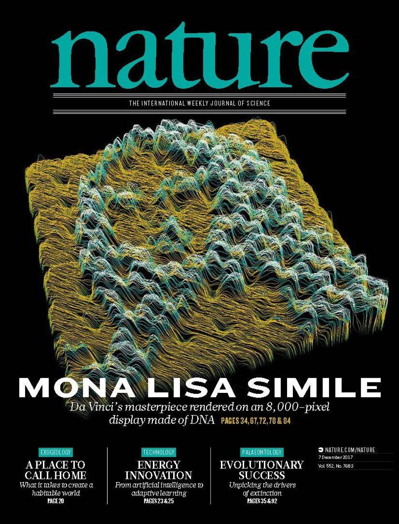 ▲ Nature杂志2017年12月7日刊的封面,是一幅由DNA生成的8000像素“蒙娜丽莎的微笑”,加州理工的研究人员利用fractal assembly的方法拼出来了这个画面。