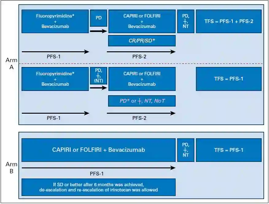 Modest DP, Fischer von Weikersthal L, Decker T, et al. Sequential Versus Combination Therapy of Metastatic Colorectal Cancer Using Fluoropyrimidines, Irinotecan, and Bevacizumab: A Randomized, Controlled Study-XELAVIRI (AIO KRK0110)[J]. J Clin Oncol, 2019,37(1):22-32.
