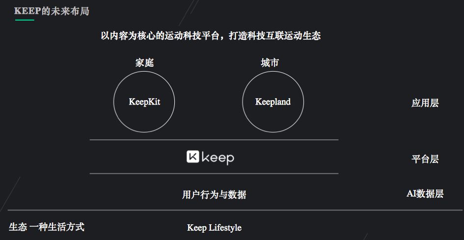 换句话说,Keep需要伴随着用户的运动轨迹和成长,覆盖更多的用户生命周期和运动场景。跑步机、智能单车、健走机和智能手环等智能硬件就可以覆盖室内外场景和多种运动类型的监测需要,而KeepLink 则可以将Keep的运动服务闭环扩张到更大。理论上,相当于未来用户参与的绝大多数运动都可以由Keep记录数据,并匹配相应的“运动前(健身指导、运动装备电商)-运动中(匹配的运动课程,以及实时身体数据监测和提醒)-运动后(新课程推荐、食谱推荐、社交互动等)”的全周期个性化服务。
