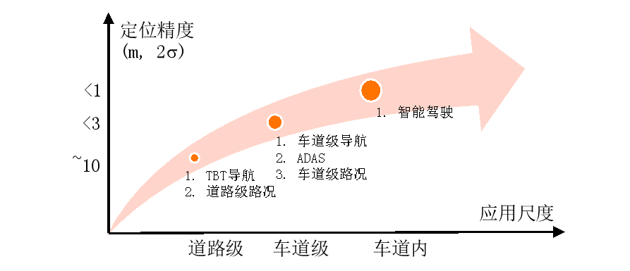 对于车道级导航,定位需要能分辨出汽车当前所在的车道,这就要求定位精度达到米甚至亚米级,而对于更先进的智能驾驶应用,为保证安全,需要定位精度达到厘米级。