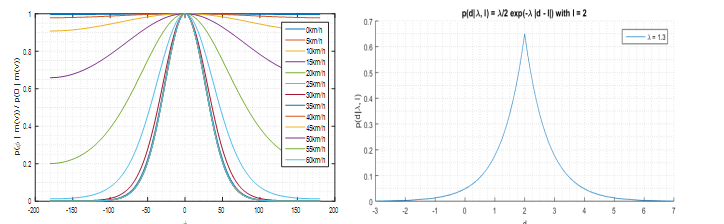 道路转弯的角度越大,速度较大的概率越低。采用Von Mises分布,以速度为超参数建立模型。根据车速和时间差计算移动距离,该距离和路径移动距离越接近,概率越大。采用指数分布建立模型。