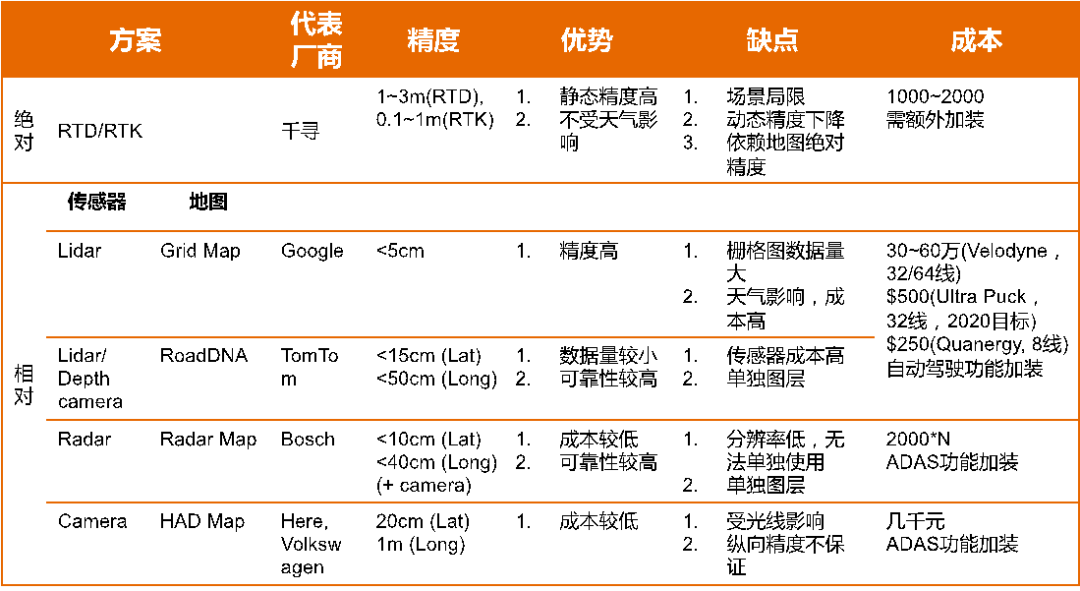 为达到更高精度的定位能力,需要对现有的定位手段进行升级。一种升级的方法是,对现有的定位输入源直接升级,如普通GPS升级为更高精度的RTK-GPS,低成本MEMS惯导升级为高精度惯导,这样可以在基本不改变原有算法框架的基础上直接获得高精度的定位能力。但缺点是,原有算法的缺陷,如长时间GPS丢失场景的累积误差问题依然存在,且成本较高。另一种方法是引入新的定位源,如激光雷达、毫米波雷达、摄像头等。这就需要针对这些新的传感器开发新的融合定位算法。不同的高精定位方案对比如下表。