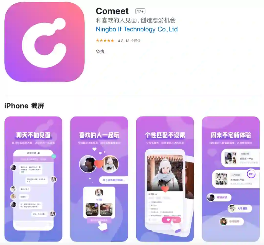 即刻推出了一款名为“Comeet”的App产品。据介绍,“Comeet”是一个让城市青年线下组局交友、拓展人脉圈子、创造恋爱机会的社交App。( Tech星球)