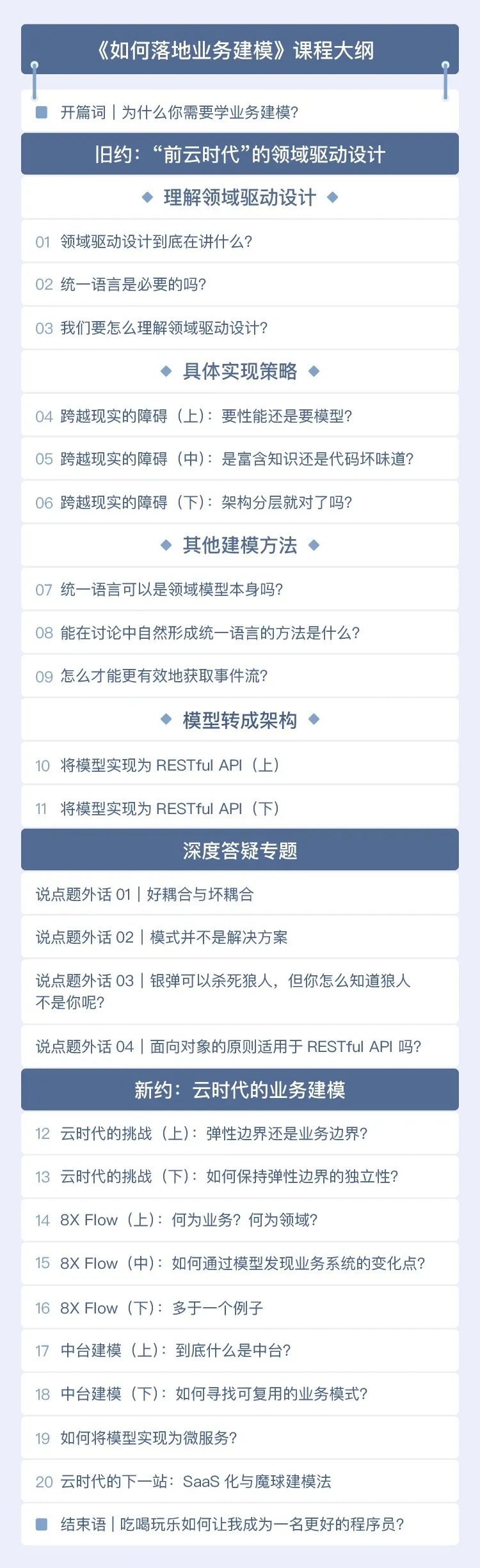 徐昊在《如何落地业务建模》专栏中,系统地讲解了建模所掌握的多种方法、原则,值得一提的是,他还在每一讲中,按步骤展示了很多领域模型与业务模型图,方便你梳理理解概念。你也可以保存下来,随时查看复习。