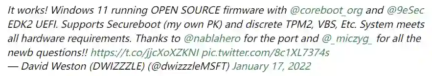 微软操作系统安全总监、开发人员 David Weston 在 Twitter 上说,他尝试在完全免费的固件上启动了当前的 Windows 11,其基础是固件组件 Coreboot(旨在用轻量级固件替换大多数计算机中的专有固件)以及作为所谓的有效负载的 UEFI 。目前在圣诞假期间该尝试已经获得成功,Weston 对 Coreboot 项目赞不绝口。但与许多其他系统不同,Windows 11 并不直接用 Coreboot 启动。