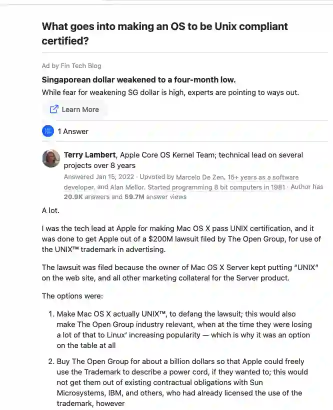 近日,苹果技术负责人 Terry Lambert 在 Quora(一个问答 SNS 网站)上回答一个问题:怎样才能使一个操作系统符合 Unix 的认证?Terry 回答称原因有很多,首先要让Mac OS X 真正成为 UNIX™,以消除诉讼;其次,以大约 10 亿美元的价格购买 The Open Group,以便苹果可以随意使用该商标来描述电源线。此前苹果曾在广告中使用 UNIX™ 商标,而 Terry 帮助苹果摆脱了由 The Open Group 提起的 2 亿美元诉讼。