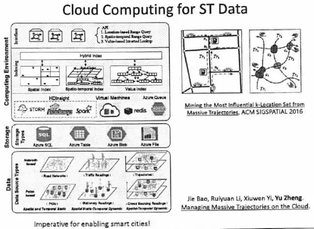 回到我们的城市计算第二个层面,刚刚讲了城市感知层面,我们要看城市数据管理。要管好城市大数据就是三方面的东西,第一,时空数据,这是时空的属性,不是一般的文本,也不是视频。第二,就是这种增强性的云平台,不是普通的云平台。第三,时空的索引,就是查询和检索算法。