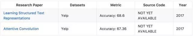 爱丁堡大学的 Yang Liu 等人提出了学习结构化的文本表征,在这篇论文中,他们关注于在没有语篇解析或额外的标注资源下从数据中学习结构化的文本表征。虽然目前暂时还没有相应的实现代码,不过他们在 Yelp 数据集上准确度能达到 68.6。而另一篇带注意力的卷积提出了了一种 AttentiveConvNet,它通过卷积操作扩展了文本处理的视野。