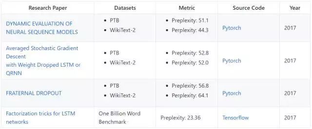 以下展示了语言建模方面当前顶尖的研究成果及它们在不同数据集上的性能。