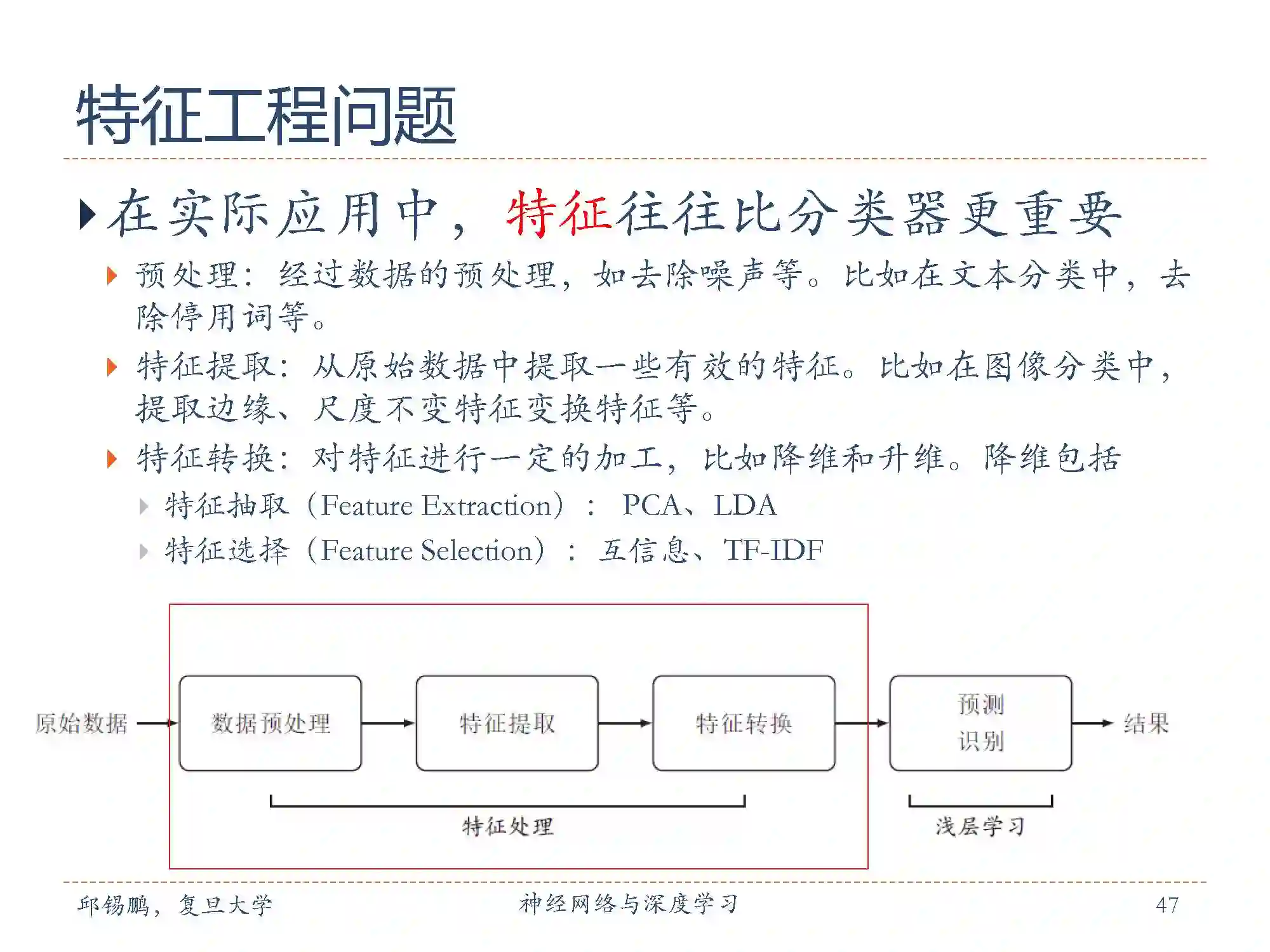 深度学习以前,各种特征都要手动的设计。特征设计的目标就是尽可能的保留原始数据中的所有信息。