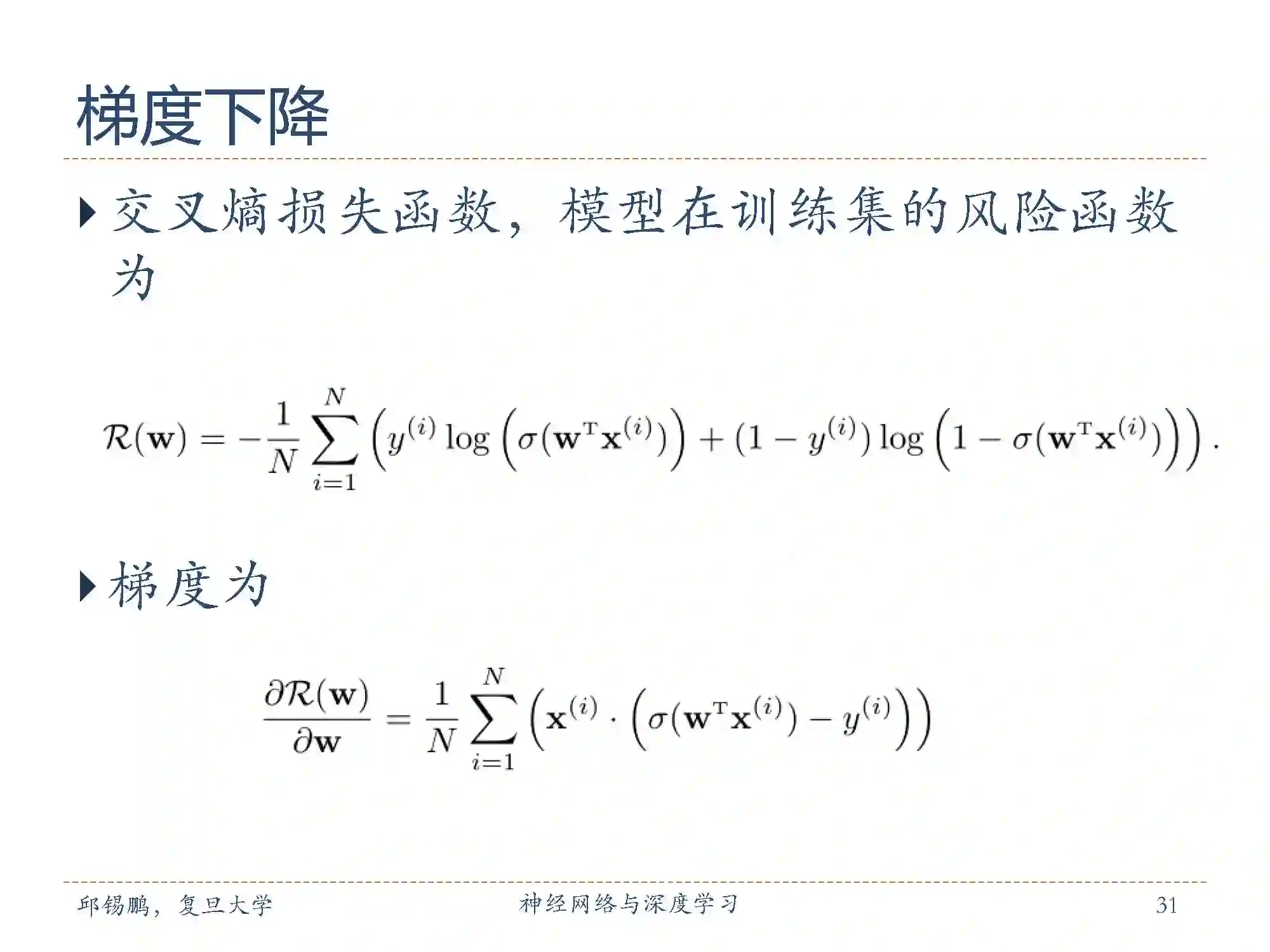 Logistic 回归采用交叉熵作为损失函数,并使用使用梯度下降法来对参数进行优化。交叉熵损失函数及其梯度如上图的公式。
