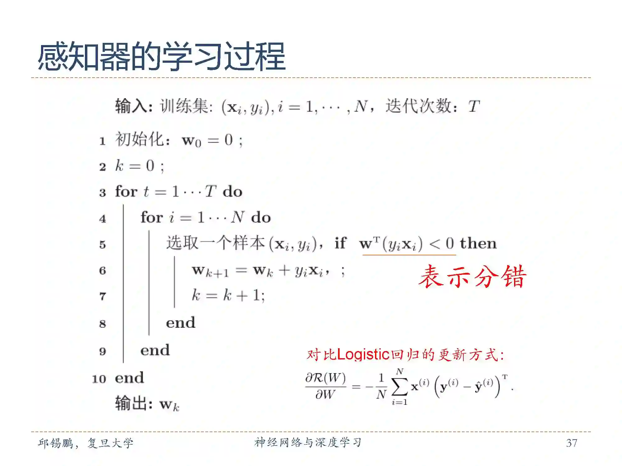 感知器的学习过程也是线性分类器的经典学习算法,先初始化一个权重向量w0(通常是全零向量),然后每次分错一个样本时,就用这个样本来更新权重。
