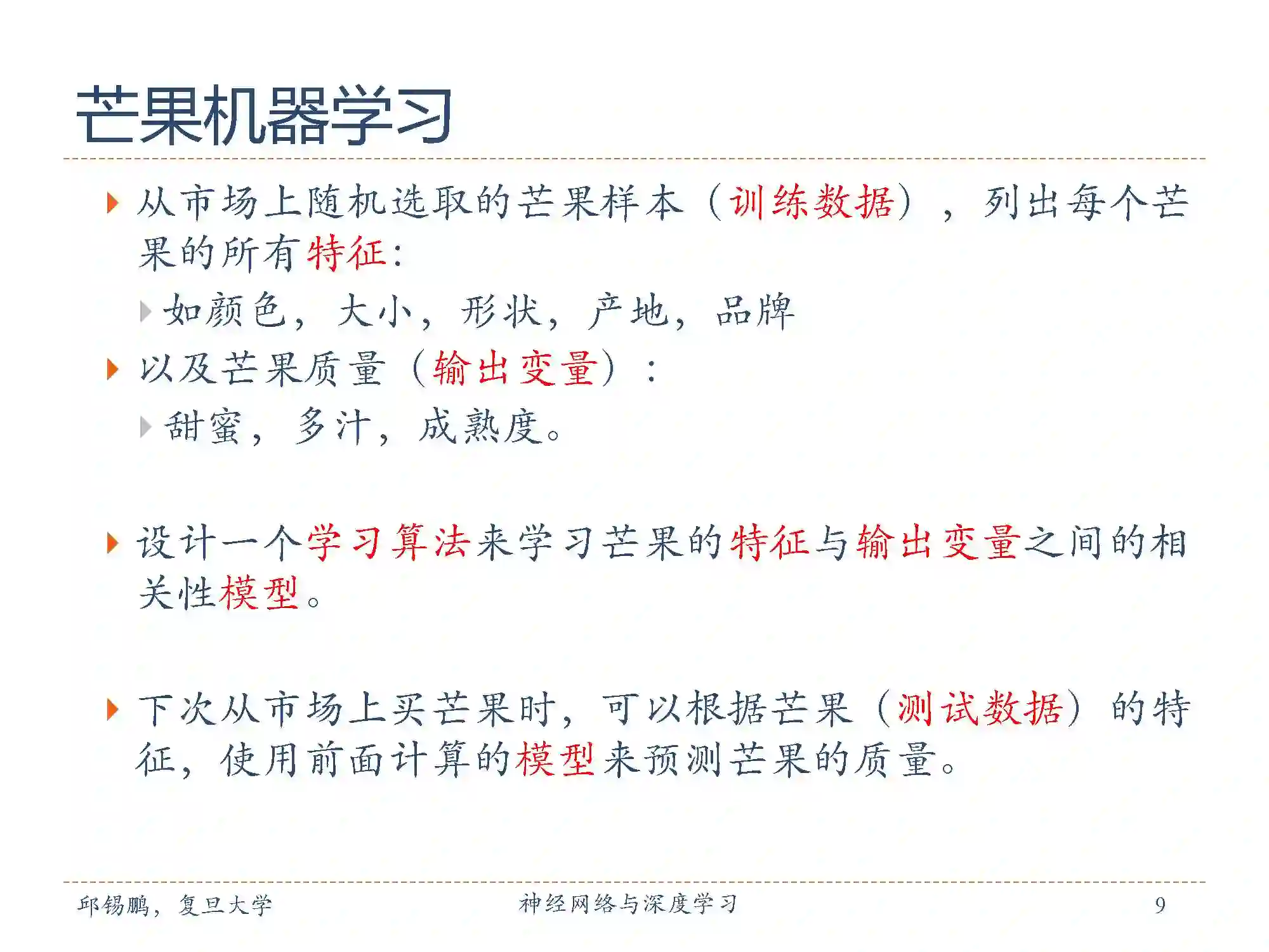 机器的训练过程和人的训练和类似,人也不是一出生就能判别出什么样的芒果是好芒果,从买到芒果后看到摸到它的一些外部特征到吃出来的味道,吃的多了在人的大脑中就会逐渐形成芒果外部特征到味道的映射。