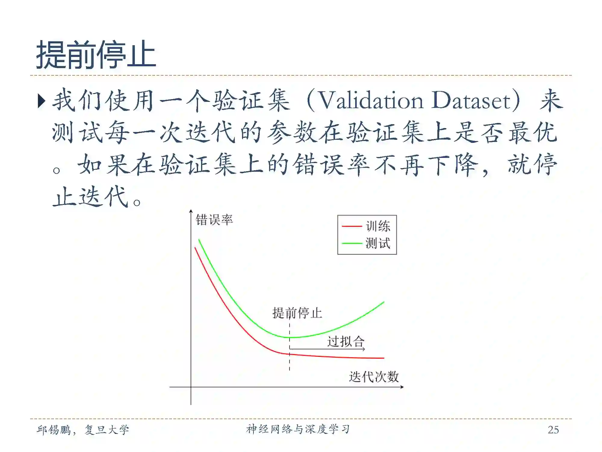 在训练的过程中时常在验证集上监测误差,在验证集上如果损失函数不再显著地降低,那么应该提前结束训练。