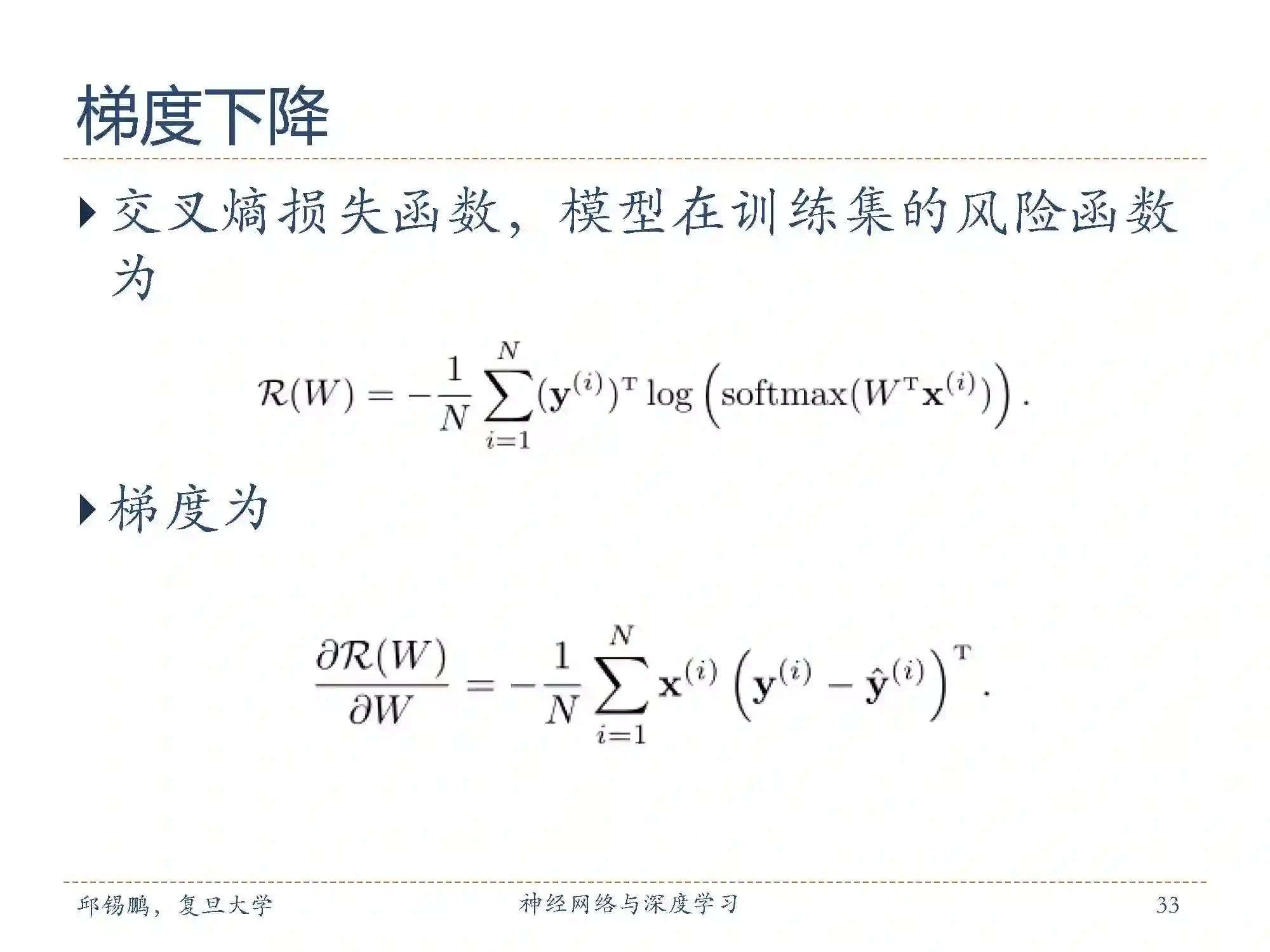 Softmax回归使用交叉熵损失函数来学习最优的参数矩阵W。采样交叉熵损失函数, softmax回归模型的风险函数如公式所示。采样梯度下降法,损失函数R(W)关于 W 的梯度如公式。