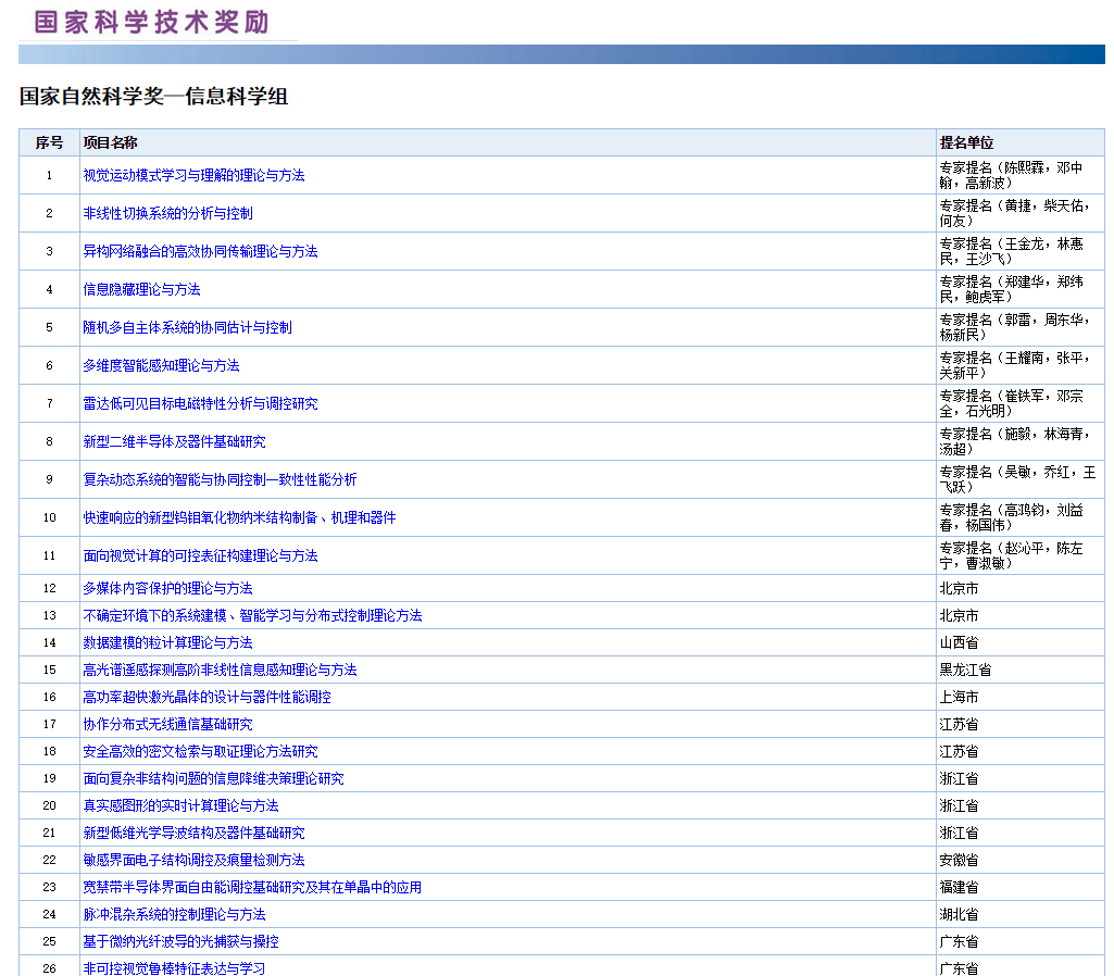 国家科学技术奖励工作办公室表示,2020年度国家科学技术奖提名工作已结束,该办共收到有关单位和专家提名的国家自然科学奖项目333项,国家技术发明奖项目333项(通用项目266项,专用项目67项),国家科学技术进步奖项目1135项(通用项目952项,专用项目183项)。