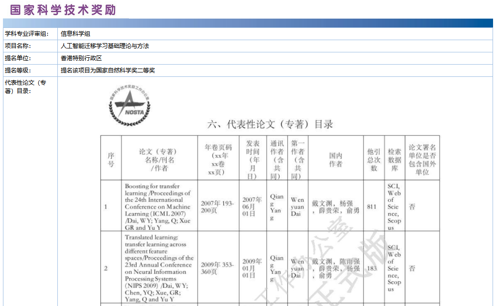 AI科技评论注意到,此次公开的2020年度国家科学技术进步奖受理项目目录,在国家自然科学奖--信息科学组下,在香港特别行政区提交的项目《人工智能迁移学习基础理论与方法》被提名该项目为国家自然科学奖二等奖,其中杨强教授作为主要完成人排名第一,戴文渊排名第二。