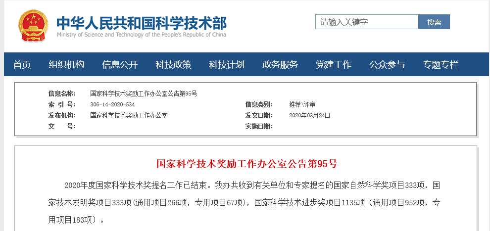 2020年3月24日,国家科学技术奖励工作办公室发布公告,对2020年度国家科学技术奖1500多项受理项目进行公示。
