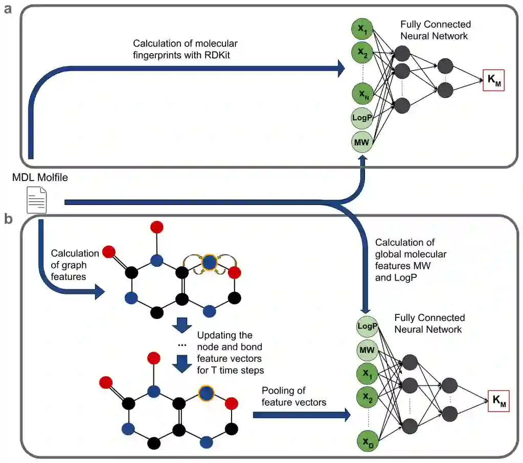 与 Km 预测相关的一个问题是药物-靶标相互作用的预测,这是药物开发中的一项重要任务。已经开发了多种预测药物靶标结合亲和力(DTBA)的方法。这些方法中的大多数是基于相似性、基于结构或基于特征的。基于相似性的方法依赖于类似药物倾向于与类似目标相互作用的假设;这些方法使用已知的药物-靶标相互作用来学习基于药物-药物和靶标-靶标相似性度量的预测函数。用于 DTBA 预测的基于结构的模型利用有关目标蛋白质 3D 结构的信息。这两种策略都不能很容易地推广到基因组规模的、独立于生物体的预测,因为许多酶和底物与充分表征的分子只有遥远的相似性,并且 3D 结构仅适用于少数酶。