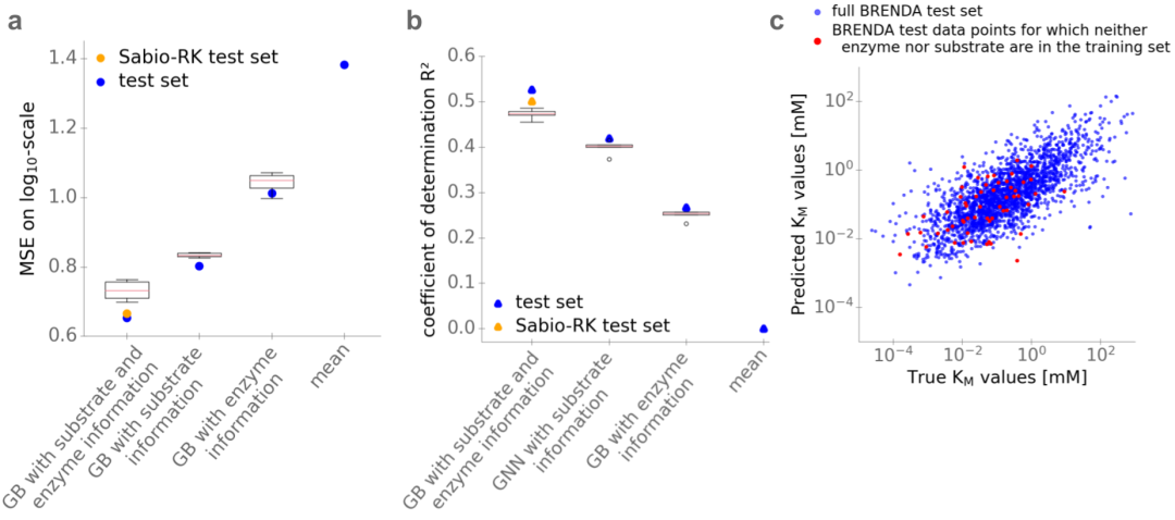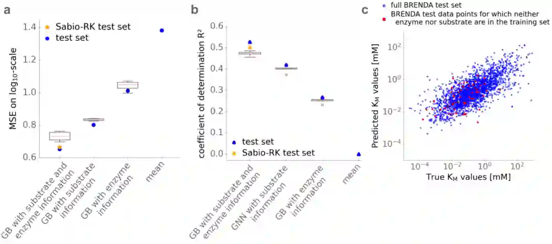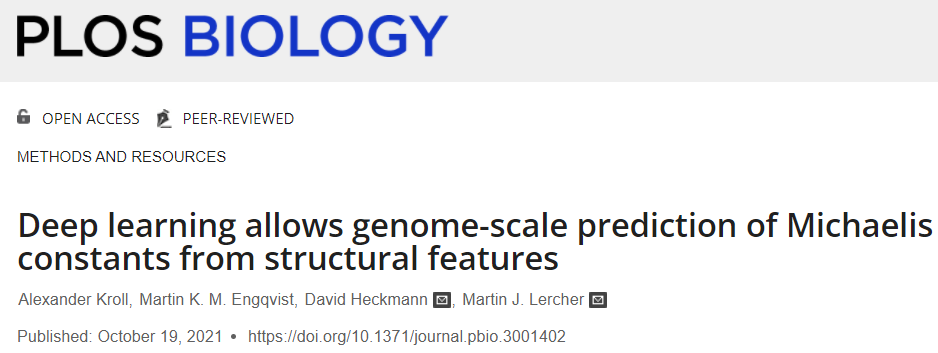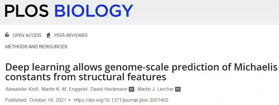 编辑 | 萝卜皮 啤酒酿造、化妆品制造、医疗保健等领域离不开酶的参与,酶可以与特定底物结合,起到高效的催化作用。我们身体细胞本身也离不开酶的参与,酶也真真切切地影响着人们的日常生活。米氏常数 Km 描述了酶对特定底物的亲和力,是酶动力学和细胞生理学研究的核心参数。由于 Km 的测量通常很困难且耗时,因此即使在模型生物中也仅存在少数酶-底物组合的实验估计值。在这里,瑞典查尔姆斯理工大学(Chalmers University of Technology)的一组研究人员,选择了一种独特的方法,使用 AI 从底物和酶的结构中预测米氏常数。构建并训练了一个独立于生物体的模型,该模型使用机器学习和深度学习方法成功预测了天然酶-底物组合的 Km 值。预测基于底物的特定任务分子指纹,使用图神经网络生成,以及使用酶氨基酸序列的深度数值表示。研究人员为 47 种模式生物提供基因组规模的 Km 预测,可用于将代谢物浓度与细胞生理学大致联系起来,并有助于细胞代谢动力学模型的参数化。该研究以「Deep learning allows genome-scale prediction of Michaelis constants from structural features」为题,于 2021 年 10 月 19 日发布在《PLOS BIOLOGY》。米氏常数Km米氏常数 Km 定义为酶以其最大催化速率的一半运行时的底物浓度;因此,它描述了酶对特定底物的亲和力。Km 值的知识对于定量理解酶和代谢物之间的酶促和调节相互作用至关重要:它将代谢物的细胞内浓度与其消耗率联系起来,将代谢组与细胞生理学联系起来。 由于 Km 的实验测量既困难又耗时,因此即使在模式生物中也不存在许多酶的实验估计值。例如,在大肠埃希氏菌这种生物化学特征最好的生物体中,只有不到 30% 的天然底物存在体外 Km 测量值,并且在体外仅对大约 2,000 个酶促反应中的约 10% 的转化率进行了测量。简介Km 值以及酶周转数 kcat 是解释代谢物浓度的细胞代谢模型所必需的。大规模动力学建模中的当前标准方法是在优化过程中估计动力学参数。这些优化通常会尝试估计比作为输入的测量值更多的未知参数,因此,由此产生的 Km 和 kcat 值具有广泛的置信范围,并且与实验观察值几乎没有联系。因此,人工智能对这些值的预测,即使只有一个数量级,也将代表朝着更现实的细胞代谢模型迈出的重要一步,并可以大大增加此类模型提供的生物学理解。
