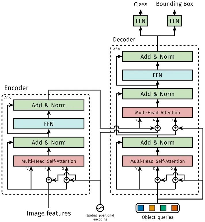 因为Decoder也具有位置不变性,Decoder的 个object query(可以理解为学习不同object的positional embedding)必须是不同,以便产生不同的结果,并且同时把它们添加到每一个Multi-Head Attention中。 个object queries通过Decoder转换成一个output embedding,然后output embedding通过FFN独立解码出 个预测结果,包含box和class。对输入embedding同时使用Self-Attention和Encoder-Decoder Attention,模型可以利用目标的相互关系来进行全局推理。