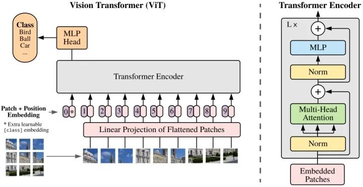 Vision Transformer(ViT)将输入图片拆分成16x16个patches,每个patch做一次线性变换降维同时嵌入位置信息,然后送入Transformer,避免了像素级attention的运算。类似BERT[class]标记位的设置,ViT在Transformer输入序列前增加了一个额外可学习的[class]标记位,并且该位置的Transformer Encoder输出作为图像特征。