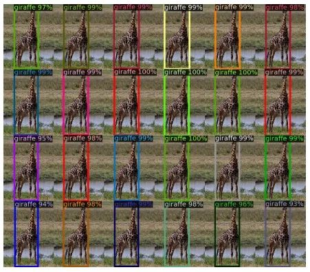 训练集中没有超过13只长颈鹿的图像,DETR实验中创建了一个合成的图像来验证DETR的泛化能力,DERT可以完全找到合成的全部24只长颈鹿。这证实了DETR避免了CNN的归纳偏好问题。