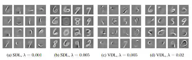 实验结果可以看到,对于两个SDL和两个VDL的字典元素(dictionary elements)来说,在稀疏度λ较低的情况下(0.001, 0.005)解码器似乎可以学到方向、笔划,甚至是是数字图形中的一部分。