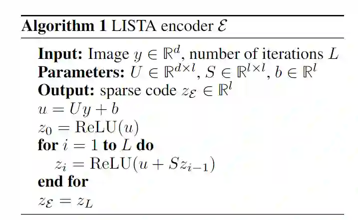 给定一个输入y和一个固定的解码器D,研究人员使用FISTA算法(近似梯度方法ISTA的快速版)进行推理来找到一个稀疏编码z*,得到的z*可以使用D中的元素最好地重建输入y。