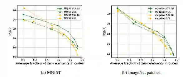 在重构质量上,SDL和VDL模型的编码器的曲线显示了由未激活编码(值为0)成分的平均百分比衡量的稀疏程度和由平均PSNR衡量的重建质量之间的权衡。