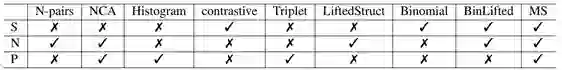 原论文表 1:不同损失函数为样本对加权所采用的相似性度量,其中 S、N、P 分别表示自相似性、负相对相似性和正相对相似性。