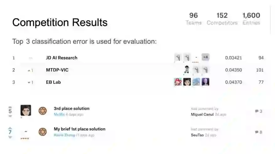 据码隆介绍,该挑战赛共涵盖 2019 类 SKU,超过一百万图像数据,是 CVPR 迄今数据规模最大、种类最多的商品识别竞赛。两个月的赛程中,全球共有 96 支队伍、152 位选手通过 1600 次提交参加了竞赛。